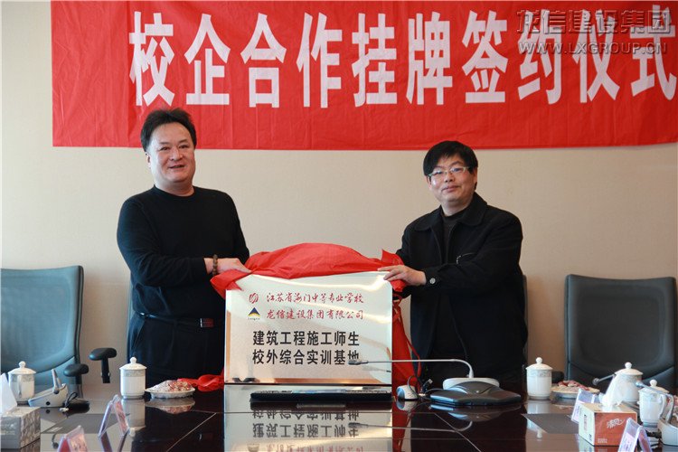 為促進校企深度合作,完善校企雙贏機制,實現校企協同發展, 2015年2月9日下午,在龍信大廈二樓會議室舉行了龍信集團與海門中專共建師生綜合校外實訓基地的揭牌儀式。海門中專的陸衛平副校長、郁建菊主任、張慧琴主管、楊海燕老師、黃其中老師,我集團總經理唐愛東、監事會主席卞勤華、集團常務副總工程師劉瑛、經營部經理賀廣海、施工技術部經理張豪、人力資源部經理黃麗英、人力資源部主管宋斌斌參加了揭牌儀式。