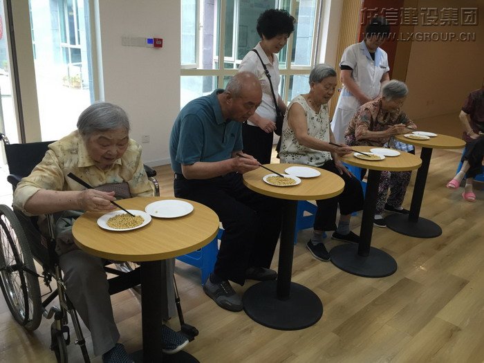 圖為叔叔阿姨正在進(jìn)行筷子夾黃豆比賽
