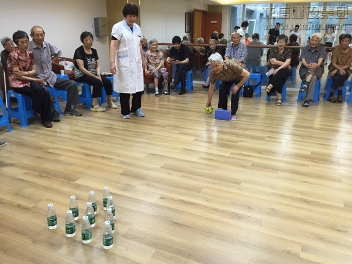 圖為509室沙阿姨正在進(jìn)行趣味保齡球比賽